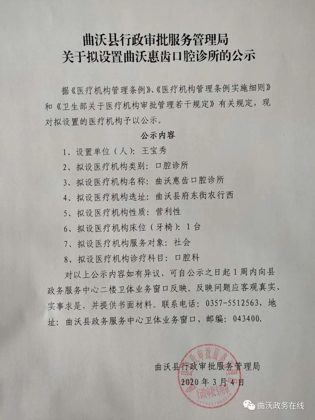 關(guān)于擬設(shè)置曲沃惠齒口腔診所的公示
