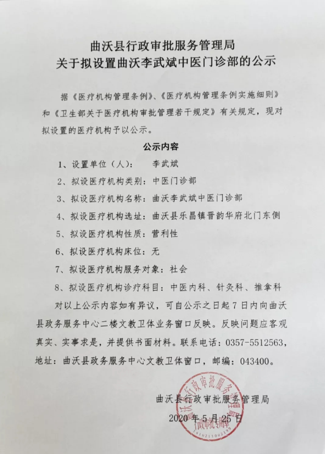 關于擬設置曲沃李武斌中醫(yī)門診部的公示