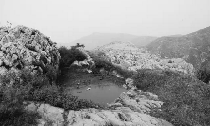 在山頂廟后不遠(yuǎn)處的峭崖下,有一汪水池,水池呈橢圓形,寬約數(shù)丈,清可見底。池雖不大,卻非常神奇,下不見泉眼,周不見水源,水從四周巖石縫隙中滲出,終年四季碧水盈池,不溢不虧。無(wú)論天有多旱,從未干涸,人們稱之為“天池”。
