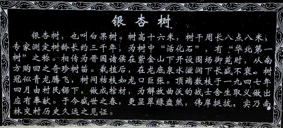 樹齡千年以上,樹圍8.8米,高38米,有植物園(活化石)之稱。南林交村中老人們夸它是宇宙間的精華,傳說為周秦遺物,百姓奉若神明。